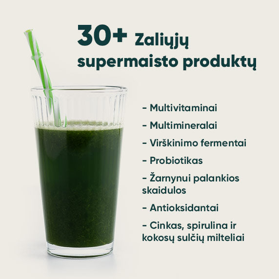 Sudėtyje - daugiau nei 30 supermaisto produktų, probiotikų, virškinimo fermentų, vitaminų ir mineralų, kurie padeda sumažinti pilvo pūtimą, padidina energiją, subalansuoja alkį, stiprina imunitetą, odą bei plaukus.