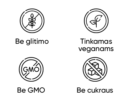 Be pridėto cukraus, užpildų, dažiklių, GMO, glitimo, sojos, pieno produktų, sunkiųjų metalų ar kitų kenksmingų medžiagų.